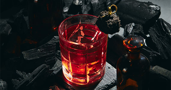 Tequila Blanco com gordura de coco e vem combinada Tokaji dry, Campari e guarnição de sponge cake, um bolo aerado de carvão ativado, resultando em um coquetel seco, amargo e encorpado.