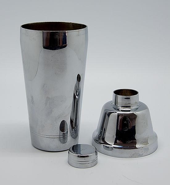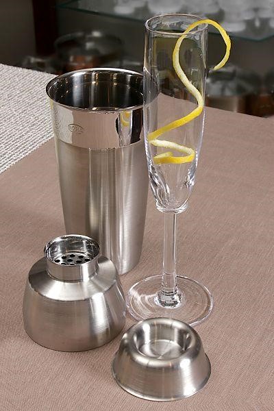 ● Coqueteleira Francesa – feita de metal, ela é dividida em duas partes: copo e tampa. Necessita de uma peneira extra para a preparação dos drinques.
