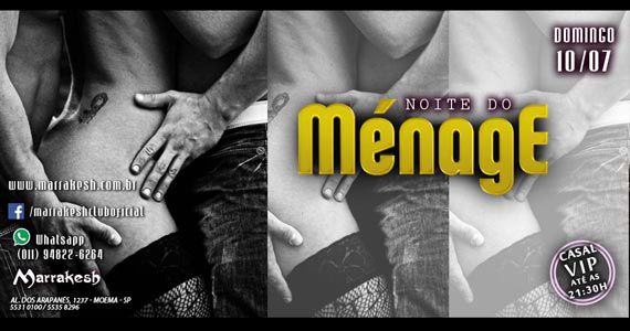 Neste domingo, 10 de julho, o Marrakesh Club recebe os agitos de mais uma Noite do Ménage. A casa recebe Shows Eróticos Interativos para esquentar o clima e a imaginação. O Marrakesh possui diversos ambientes, pista de dança com decoração de espelhos e jardins naturais, bar com TV e mesas bistrô.Confira a promoção do dia em nosso cardápio. Aproveite!!!
