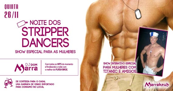 Nesta quinta-feira, 26 de novembro, o Marrakesh Club recebe os agitos da Noite dos Stripper Dancers para animar as mulheres com um show pra lá de especial com Titanic e amigos. A casa oferece de cortesia para o casal: uma garrafa de vinho importado para consumo no local! A casa ainda recebe o DJ Dom Marra, tocando todos os hits do momento e o melhor do flash back. Aproveite!!!