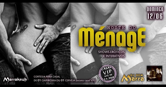 Neste domingo, 12 de junho, o Marrakesh Club recebe os agitos de mais uma Noite do Ménage. A casa recebe Shows Eróticos Interativos para esquentar o clima e a imaginação. O Marrakesh possui diversos ambientes, pista de dança com decoração de espelhos e jardins naturais, bar com TV e mesas bistrô.Confira a promoção do dia em nosso cardápio. Aproveite!!!