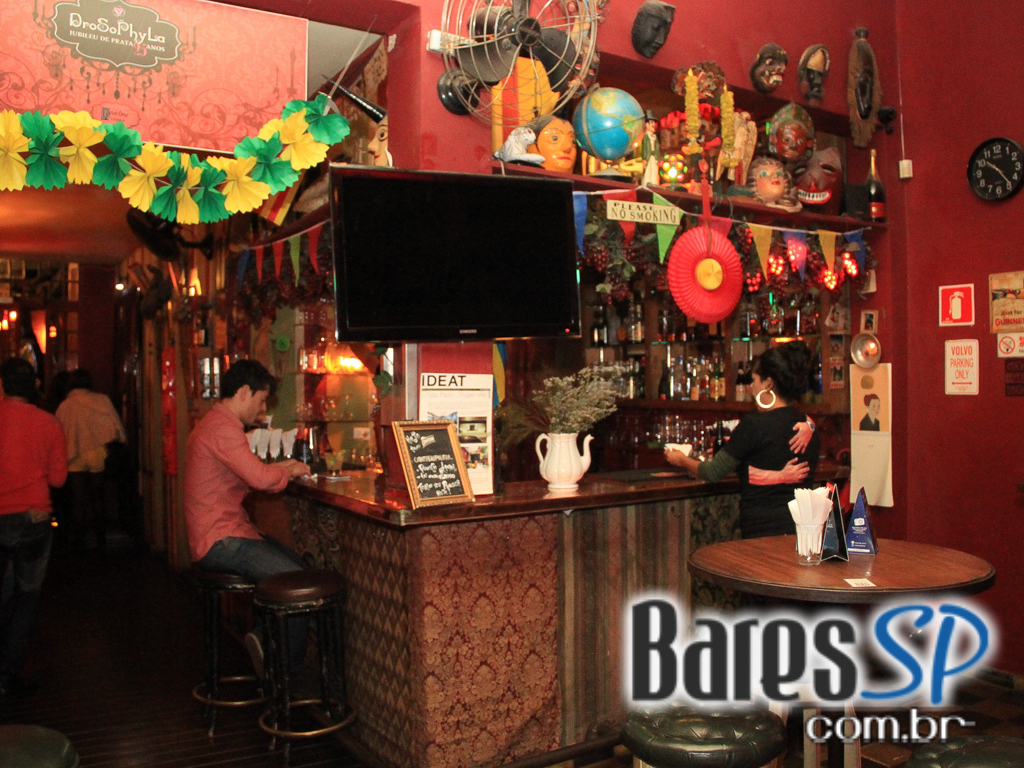 Na véspera de feriado 18 de Junho, o Drosophyla ofereceu um descontraído happy hour para o público. O bar possui um mezanino, parede decorada com bichos de plástico (e de verdade) como se fosse troféu de caça, luminárias de escorredor de macarrão, sofá vinho e vitrine de mais de 5 metros onde ficam as famosas jóias da coroa, uma divertida e variada coleção com objetos pescados em viagens que os proprietários fizeram para a China, Vietnam, Nova Zelândia, Polinésia Francesa, Ilha da Páscoa, Tailândia, Indonésia. No cardápio variedades de pratos e bebidas destaque para as caipiroscas de carambola com manjericão ou manga com pimenta rosa entre outros drinks.