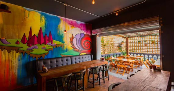 Instalações elétricas e hidráulicas aparentes por cima de madeira e tijolinhos à vista. Telas aramadas nas paredes, decoração com luzes indiretas e grafites coloridos. Mesas com sofás e almofadas confortáveis, reunidos num ambiente com 32 lugares sentados, incluindo um bonito bar na entrada. Esse é o cenário do Come On Burger!