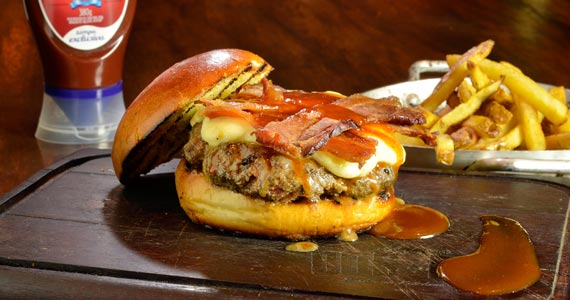 Hambúrguer de 200g, bacon, gorgonzola e molho barbecue no pão da casa ou no pão de pimenta do reino (R$ 29,00-Almoço e Jantar)