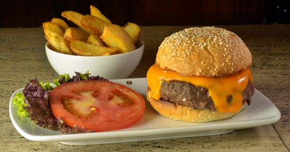 Hambúrguer de 200g, com queijo prato ou cheddar, acompanhado das deliciosas batatas rústicas da casa (R$ 43,00-Jantar)