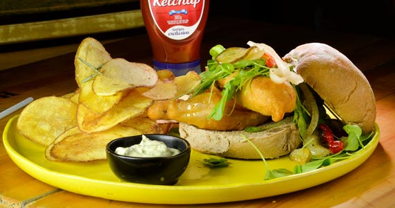 hambúrguer de tilápia na massa de cerveja, relish de pepino, agrião, mel e batatas rústicas (R$ 28,00-Almoço e Jantar)