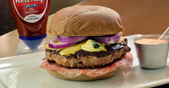 Pão preto adocicado, hambúrguer de picanha de Búfalo de180g, salame milanês, queijo emmental fundido com leve toque de roquefort, cebola roxa e maionese de pimenta sriracha (R$ 39,00-Almoço e Jantar)