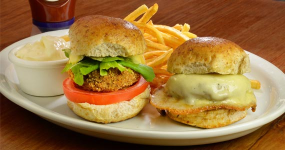 Hambúrguer vegetariano com grão de bico, tomate seco e legumes grelhados. Servido com coalhada seca e fritas sequinhas (R$ 32,00-Almoço e Jantar)