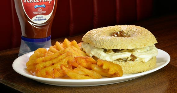 Hambúrguer de picanha, cebola picada, cream cheese, no pão de bagel. Batata Crisscuts acompanha (R$ 27,49-Almoço e Jantar)