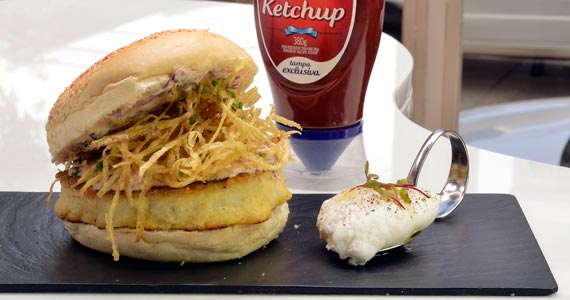 Hambúrguer de bacalhau, maionese de azeitonas, cebola confit, ovo poché e palha de mandioquinha (R$ 36,00-Almoço e Jantar)