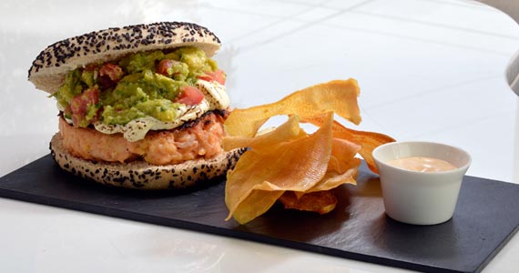 Hambúrguer de salmão, guacamole, cream cheese e maionese picante (R$ 31,00-Almoço e Jantar)