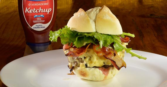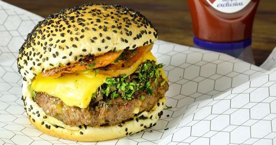 Pão de hambúrguer com gergelim e parmesão, maionese Fifties, hambúrguer de contra-filé, queijo prato derretido com cebola na chapa, ovo, bacon crocante e alface (R$ 25,90-Almoço e Jantar)