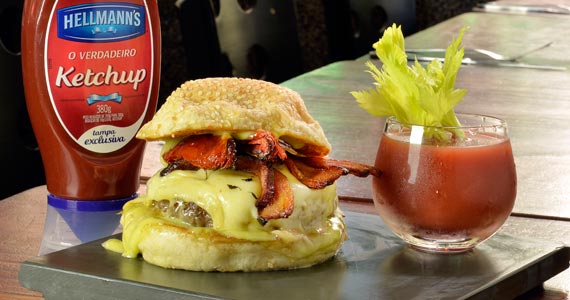 pão, hambúrguer, blue cheese, bacon artesanal, agrião, picles de cebola roxa e maionese de balsâmico (R$ 29,00-Almoço e Jantar)