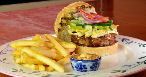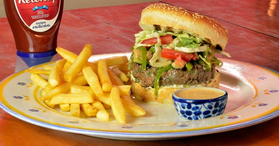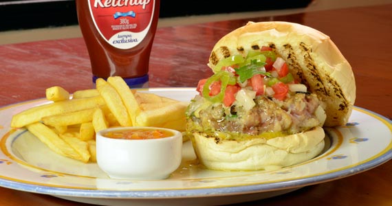 delicioso burger estilo tex mex feito com 200gr de fraldinha, pico de galo, guacamole, queijo cheddar derretido, cebola roxa e chilli. Batatas fritas acompanham (R$ 32,00-Almoço e Jantar)