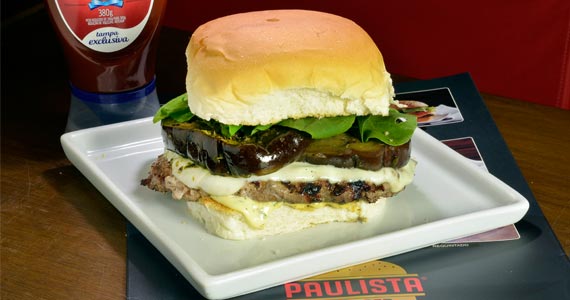 Hambúrguer de 220g, muçarela de bufála, maionese cremosa, berinjela assada no azeite e manjericão e rúcula, no pão tradicional ou ciabatta (R$ 28,00-Almoço e Jantar)