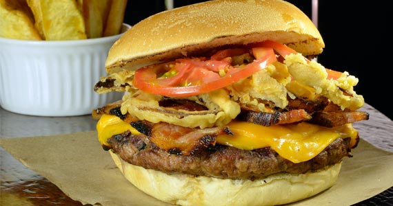 pão, hambúrger, american cheese, bacon artesanal, cebola, ovos mexidos, maionese e onion rings (R$ 29,00-Almoço e Jantar)