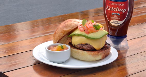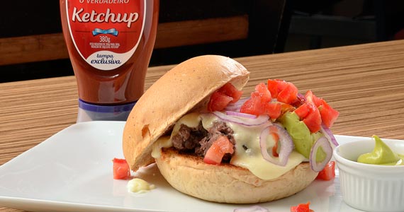 hambúrguer com queijo da casa, creme guacamole, cebola roxa, tomate e gotas de TABASCO® Habanero servido no pão tradicional da casa. (R$ 27,00-Almoço e Jantar)