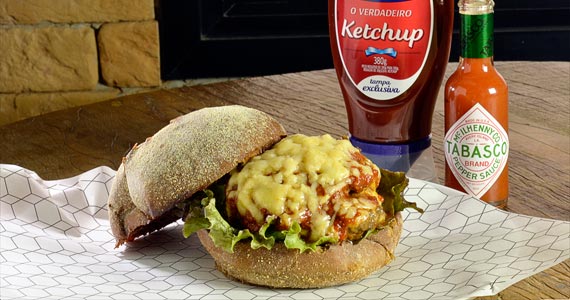 hambúrguer empanado em farinha especial, coberto com queijo parmesão e muçarela, molho de tomates frescos, alface americana e maionese de manjericão com TABASCO® Habanero. (R$ 27,00-Jantar)