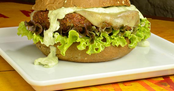 hambúrguer vegetariano (cebola, alho, salsinha, cenoura, abobrinha, feijão branco, grão de bico, cevadinha, uvas passas, castanha de caju, proteína de soja hidratada e farinha de rosca), mozzarella de búfala, alface americana, tomate e TABASCO® Green no pão de hambúrguer australiano. Acompanha batatas spicy. (R$ 25,00-Almoço)